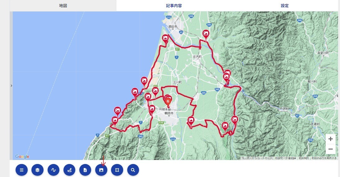 地図エディタの編集画面に入ったら、左下のメニューの右から3番目に写真マークがあります。このマークを押してから、写真を貼りたい場所をクリックするとそこにピンを立てることができます。