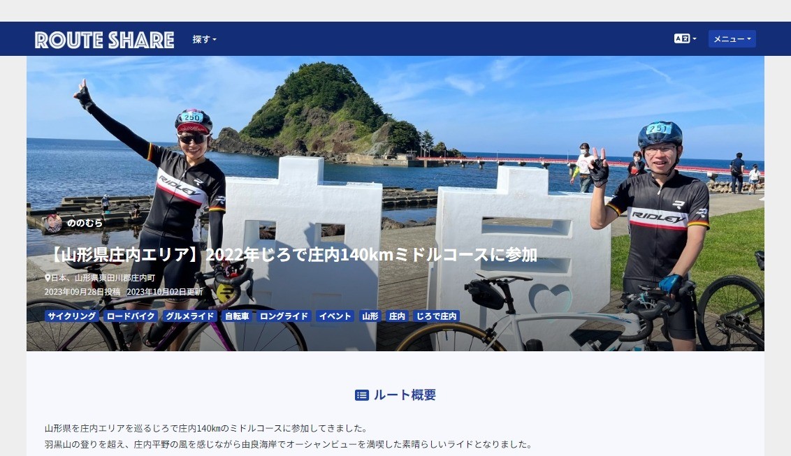 2022年に開催された山形県庄内エリア【じろで庄内140km】の写真・エピソードを、Stravaから抽出したルート上に落とし込んでまとめています。