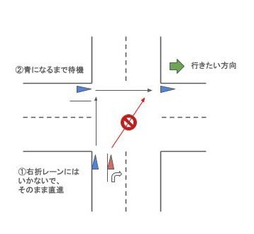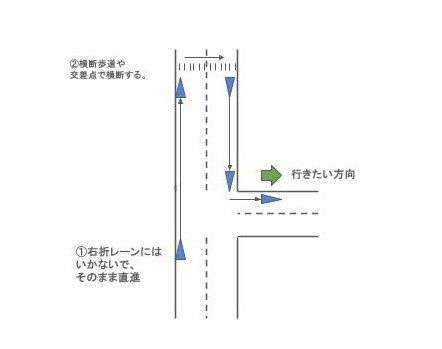車道の右折レーンに入ってそのまま移動していませんか?自転車は右折する場合、二段階右折と言って下図のようにして移動する必要があります。