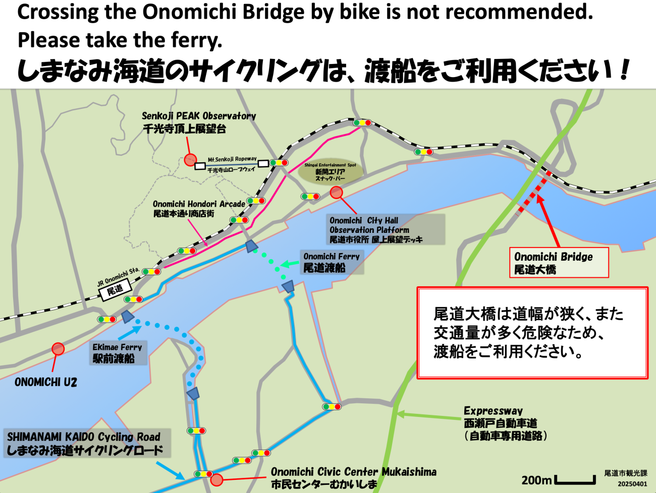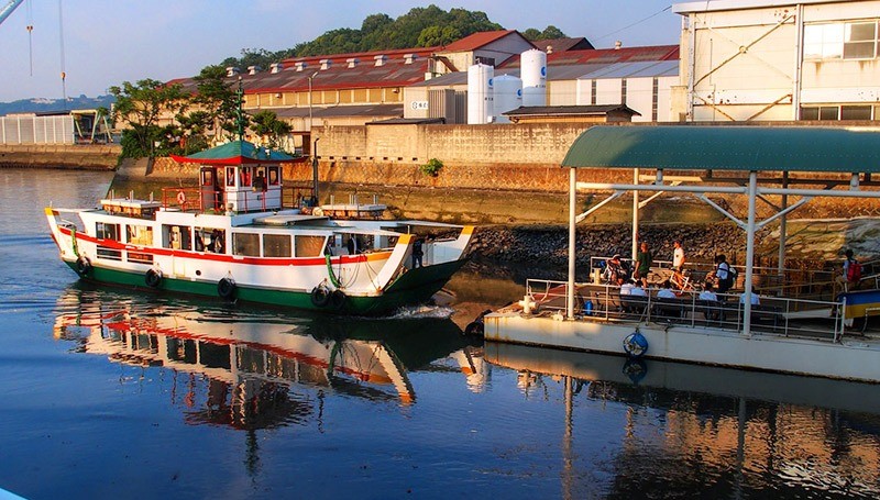 このコースの場合、尾道駅前レンタサイクルを利用すると便利です。渡船に乗船し向島へ行きます。(橋を渡らないの?という疑問も出てきますが、本島と向島を結ぶ尾道大橋は道幅が狭く危ないので、渡船を利用しましょう。尾道市も注意喚起を行なっています。)