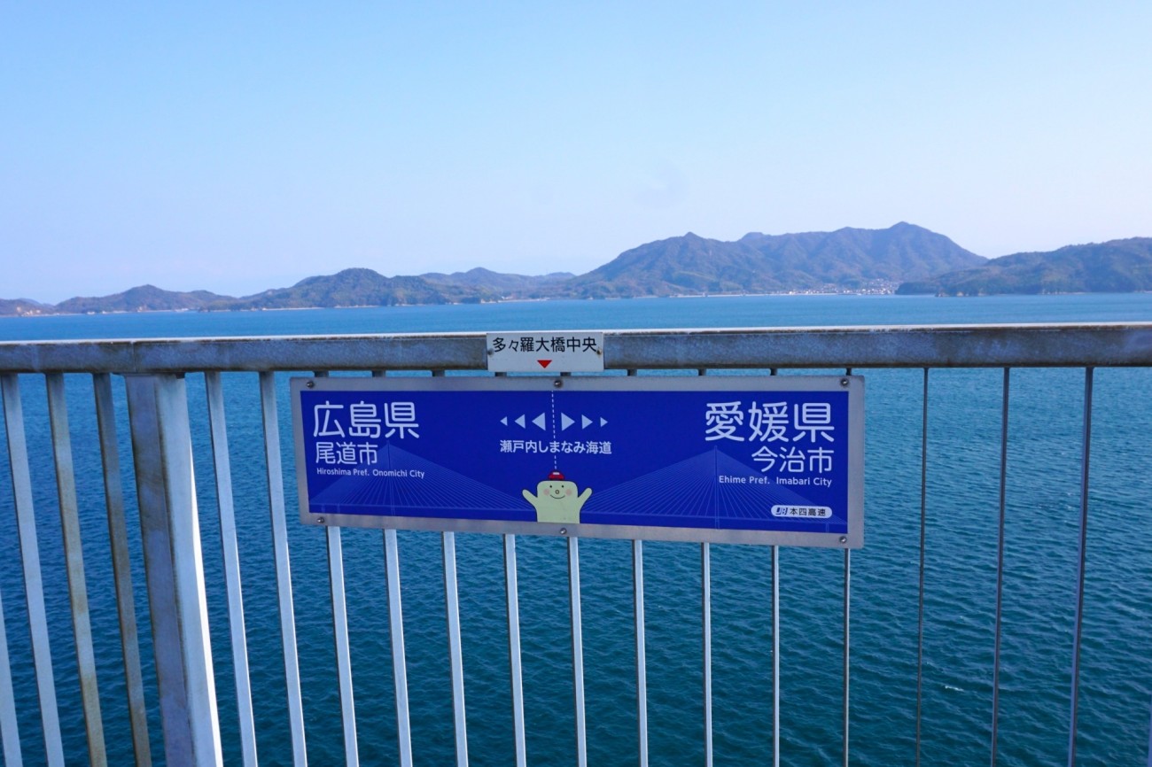 橋の中央が広島県と愛媛県の県境になっており、白線で示されたラインで記念撮影が人気。 橋の上からは瀬戸内の穏やかな海と島々が一望できます。